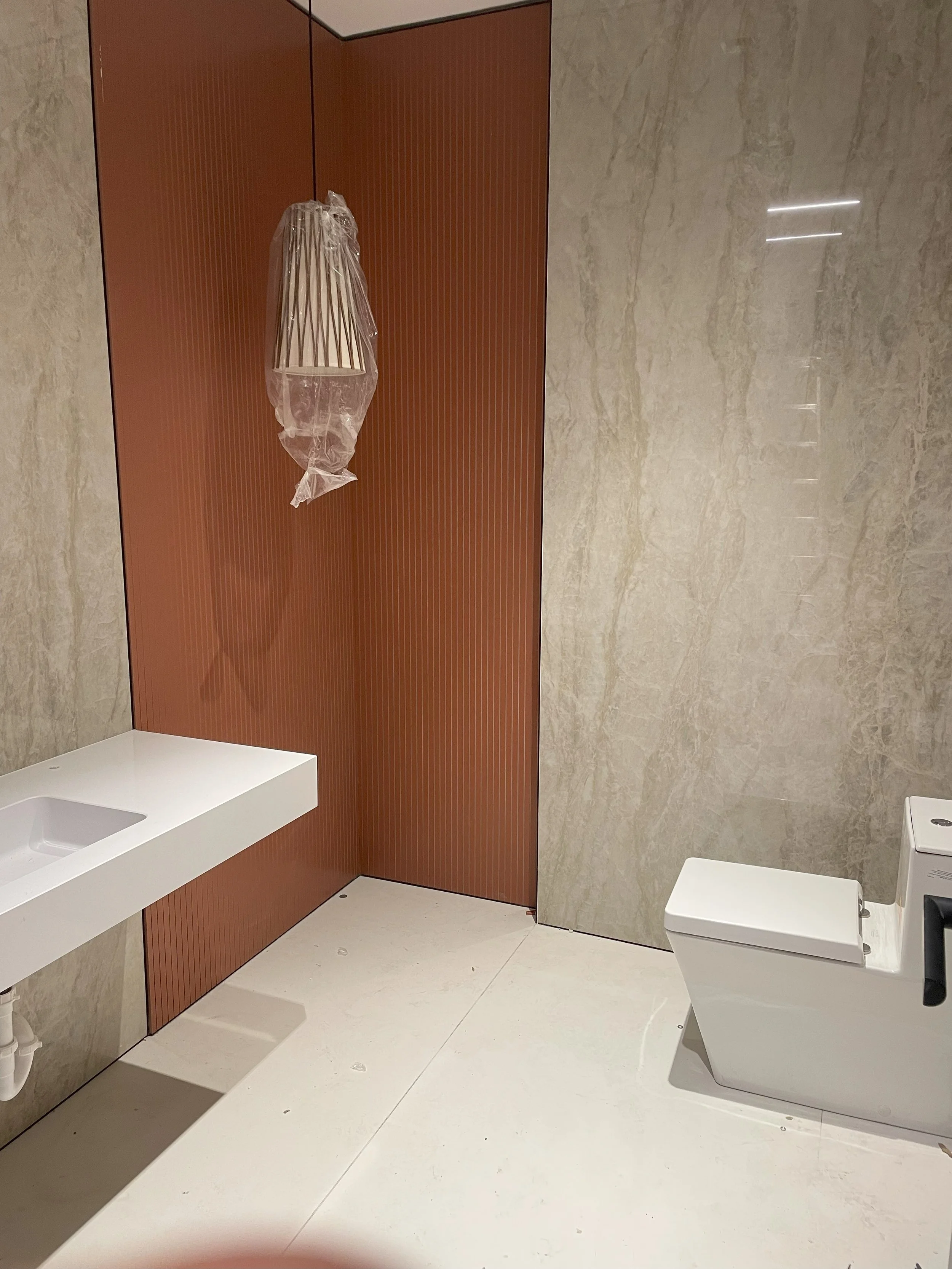 There is also an atelier area made specifically to enable designers to work with their clients in developing material pallets for their projects. The highlight of the space is a spacious open kitchen and presentation area which allow for larger gatherings while simultaneously featuring the broad range of installation options for Cosentino’s product offerings including Silestone and Dekton. Even the bathrooms provide an opportunity to show off the various thicknesses and textures available in the solid surface slabs.