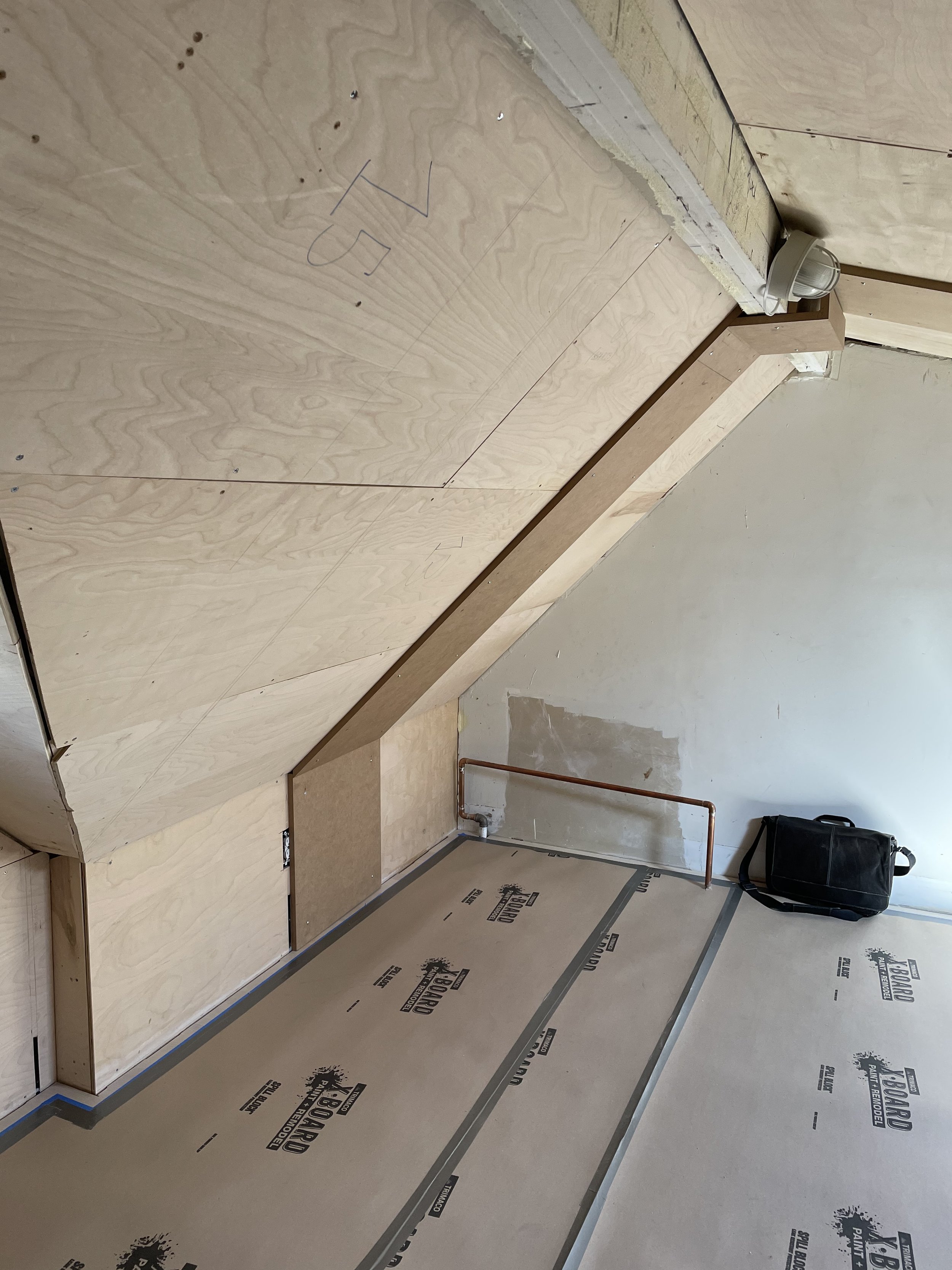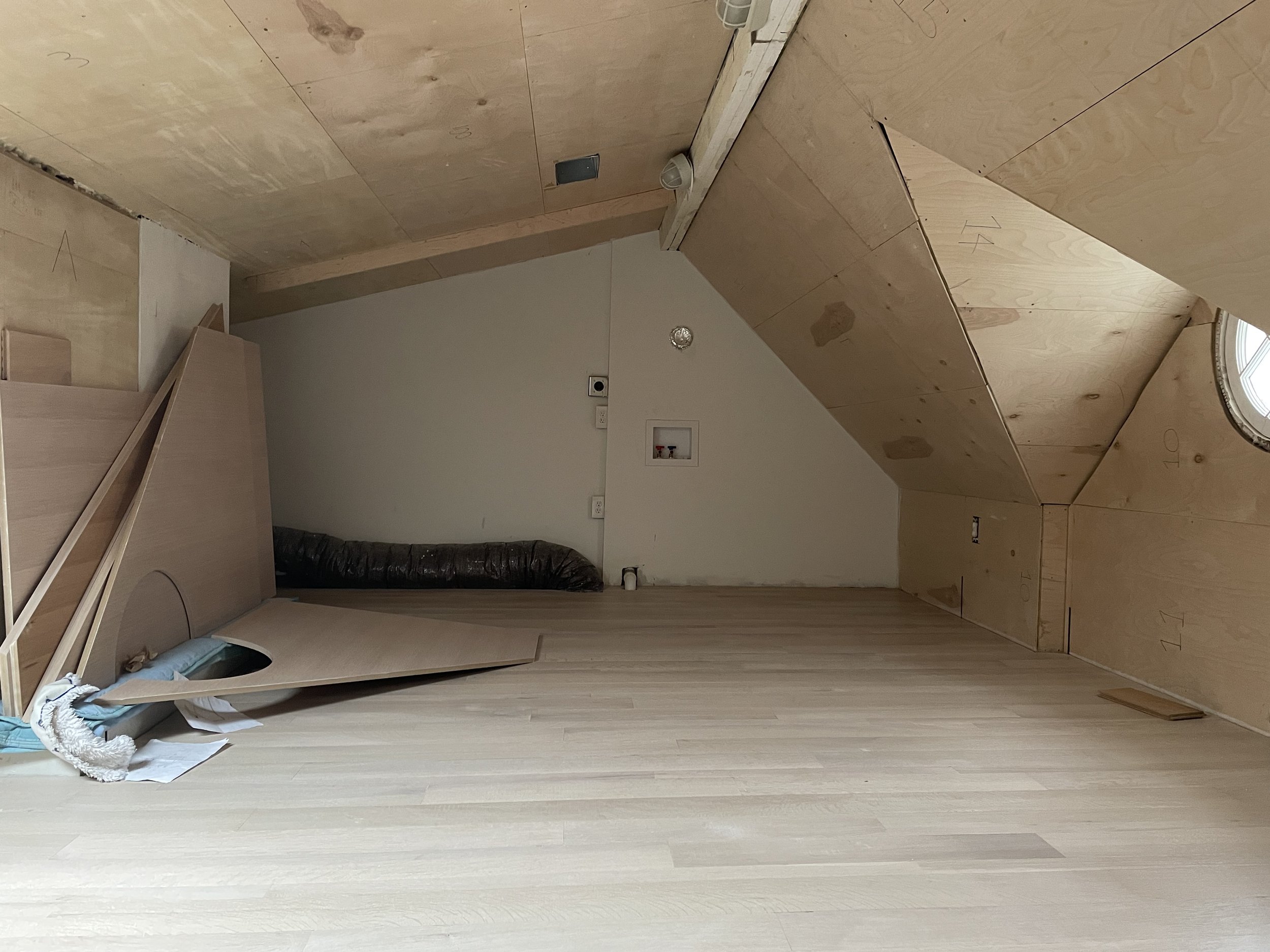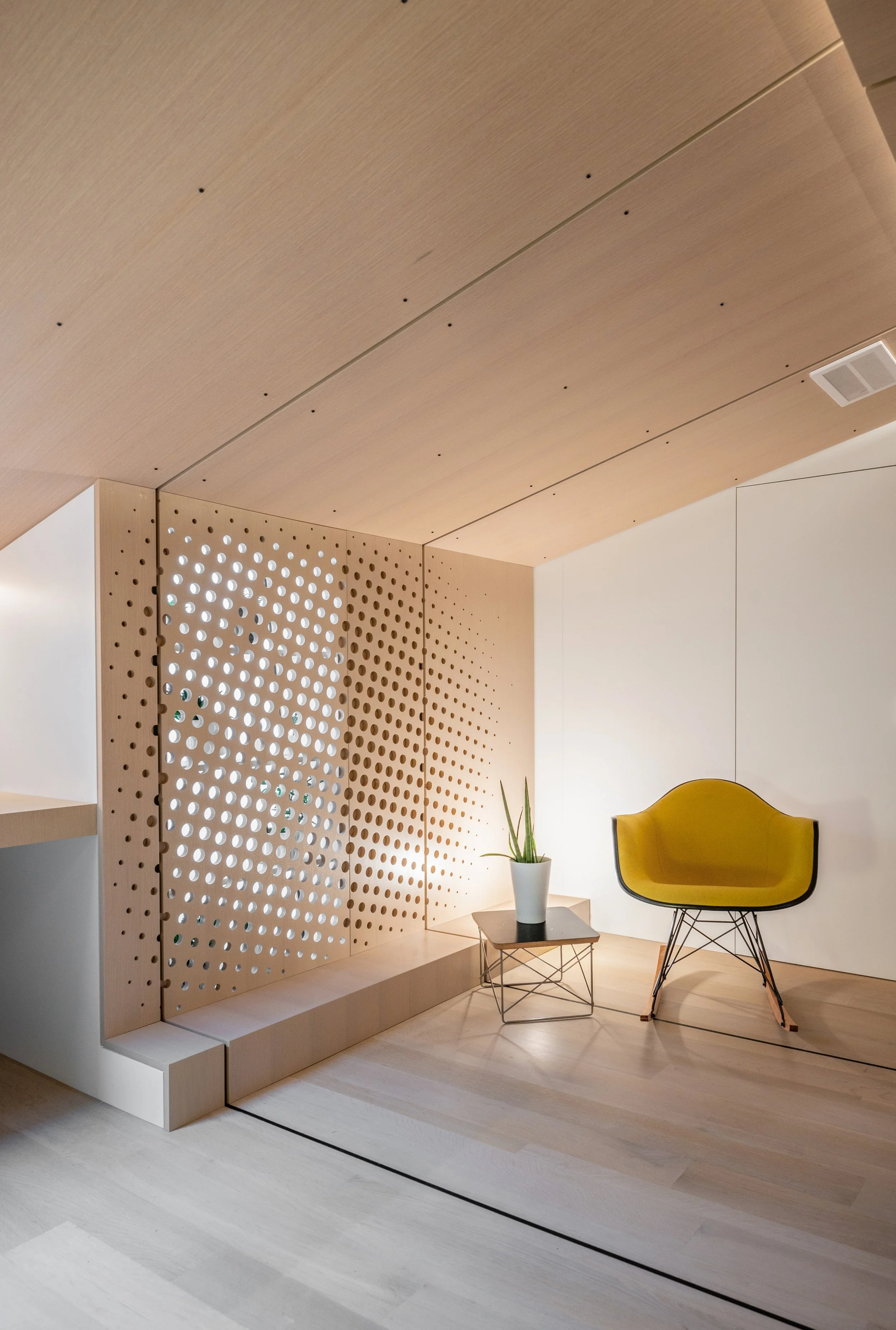 At the heart of our practice, we are architects who are passionate about the act of making. We love using familiar materials in new and unexpected ways. We love investigating new ways for the ceiling to connect to the wall and for the wall to connect to the floor. It was ultimately the possibility of this type of intimacy that led us to accept a commission to design a tiny loft office and guest bedroom in the attic of a Cleveland Park duplex.