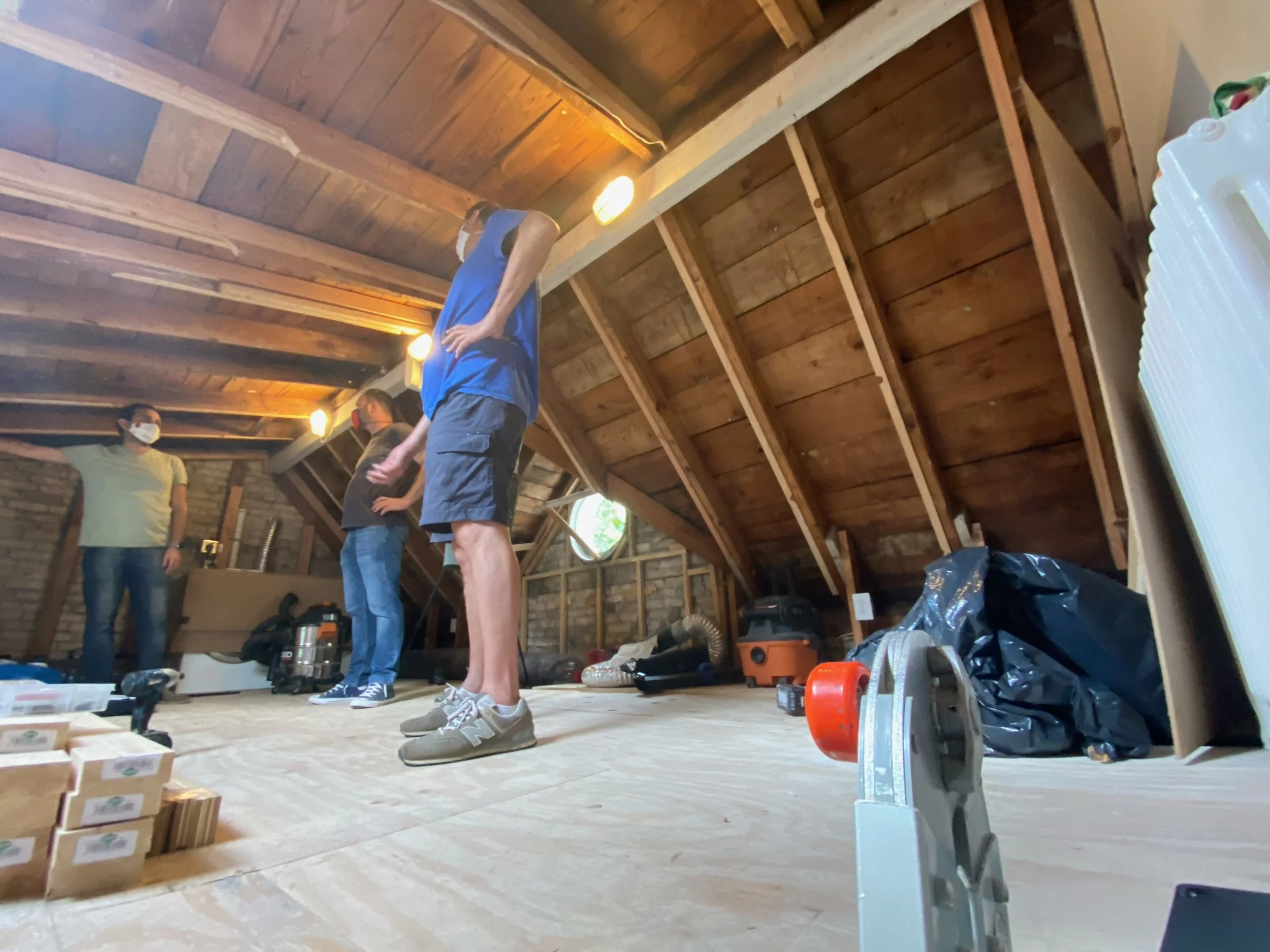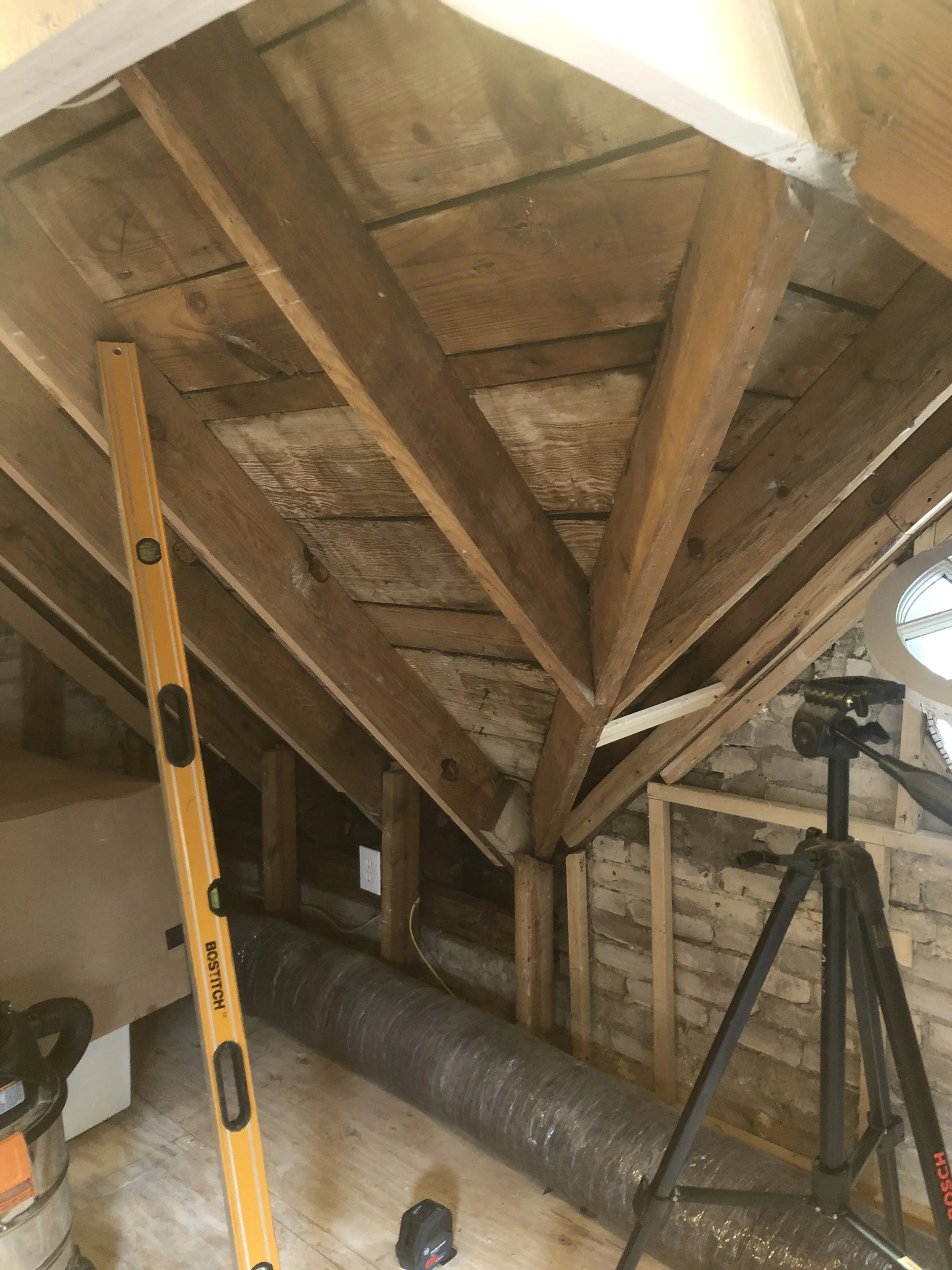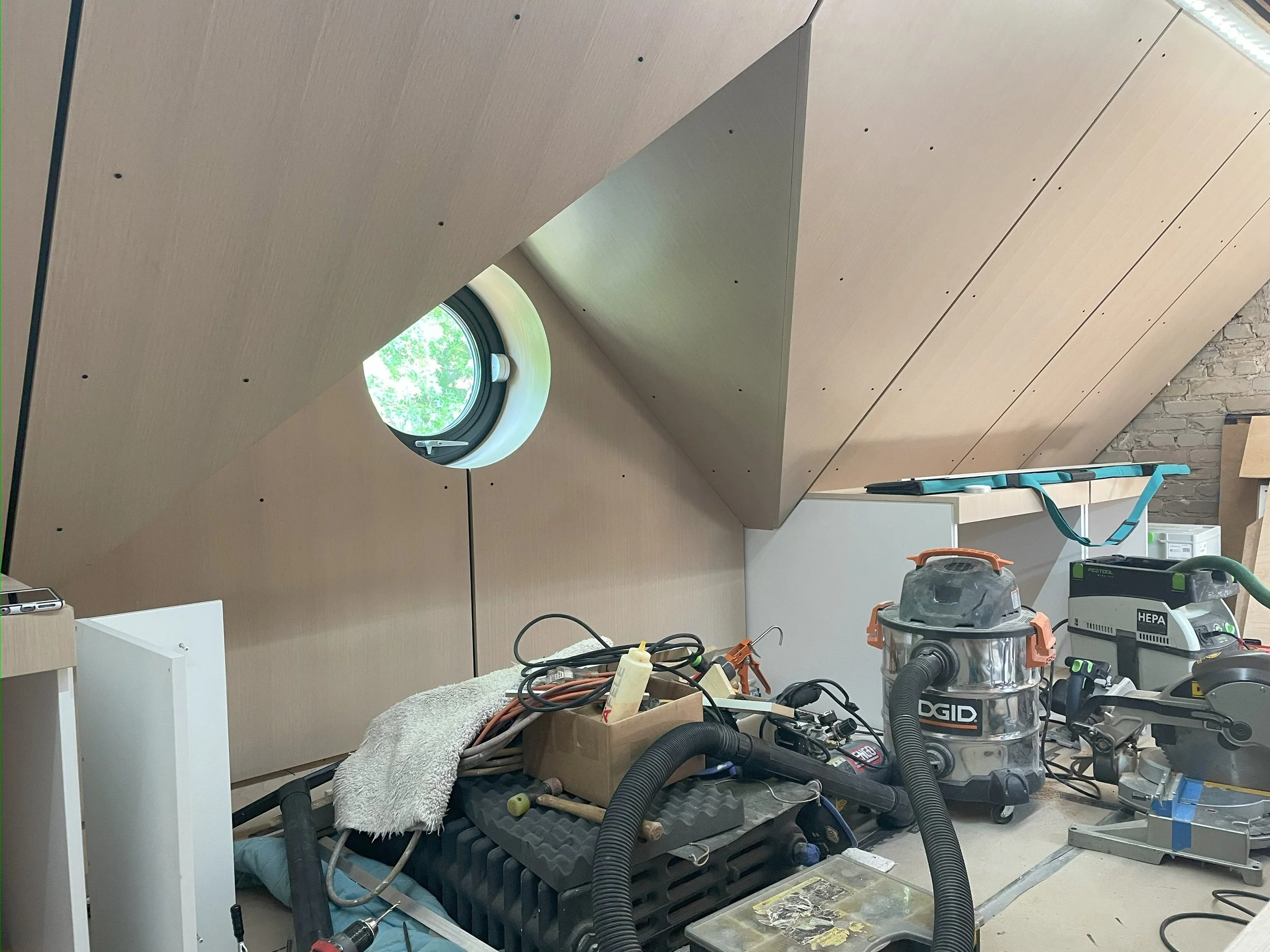 We were asked to renovate a cramped, under-insulated and underutilized attic space in order to create a home office that could alternatively be used as a guest bedroom. The extremely small space (only 350 square feet and just over 6 feet tall at the highest point) also needed to provide storage, a closet, laundry and access to the back portion of the attic. Although the space and program presented multiple challenges, the clients for this project (a couple and their son) were as invested in the design as we were, which allowed us to take risks that we may not have been able to otherwise.